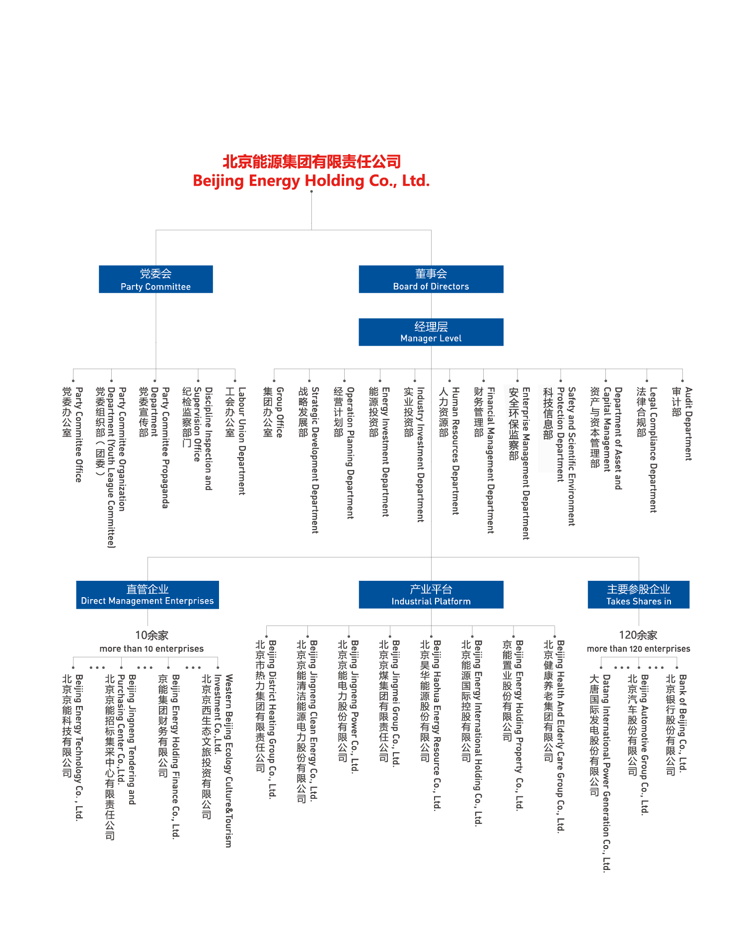 北京能源集團有限責任公司(以下簡稱“京能集團”或“集團”)是北京市人民政府出資設立的國有獨資公司,肩負著保障首都北京能源安全可靠供應的重任。集團成立于2004年,由原北京國際電力開發(fā)投資公司和原北京市綜合投資公司合并而成,2011年、2014年先后又與北京市熱力集團有限責任公司、北京京煤集團有限責任公司實施合并重組,實現了產業(yè)鏈條融合互補。經過多年的資源整合,集團由單一能源產業(yè)發(fā)展為熱力、電力、煤炭、健康文旅等多業(yè)態(tài)產業(yè)格局。2024年底,集團資產規(guī)模達4934億元,年營業(yè)收入975億元,全資及控股企業(yè)860余家,參股企業(yè)120余家,擁有員工3.4萬余人,投資區(qū)域遍布全國33個省市區(qū)以及海外,控股京能清潔能源、京能電力、昊華能源、京能置業(yè)、北京能源國際、京能熱力六家上市公司,盈利水平長期穩(wěn)居北京市屬企業(yè)前列。2024年在中國企業(yè)500強排名第247位,中國服務企業(yè)500強排名第87位。